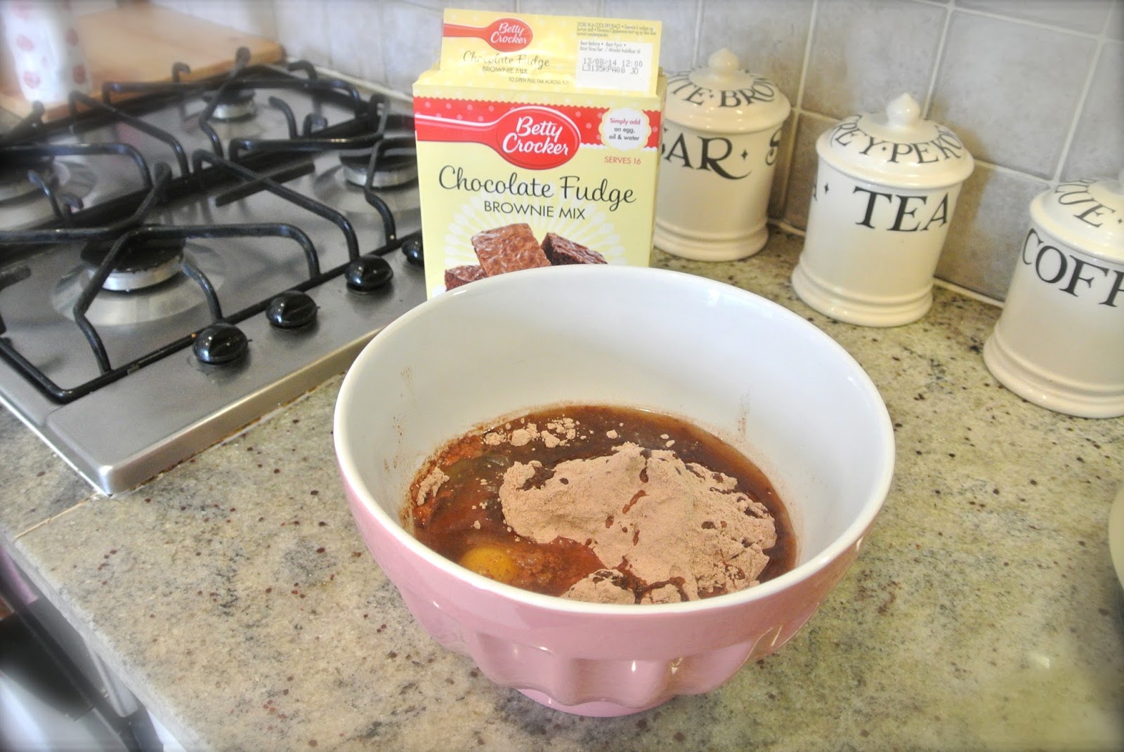 the brownie mixture thinly (about 2cm max in thickness) and pop it in the oven.