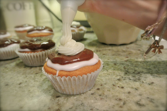 for a while. Use a spoon to apply to the cupcakes once the pink icing is