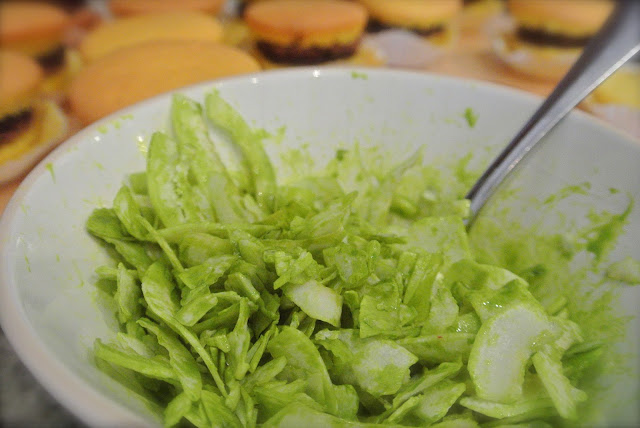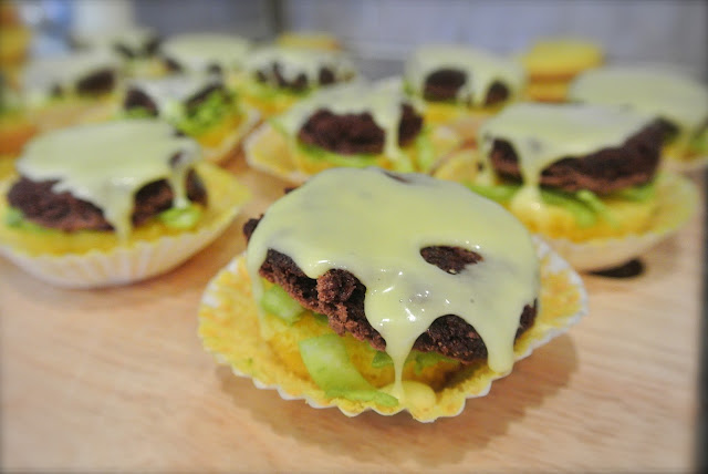 the food colouring. Spoon the yellow icing onto the burger ‘patty’; don’t be