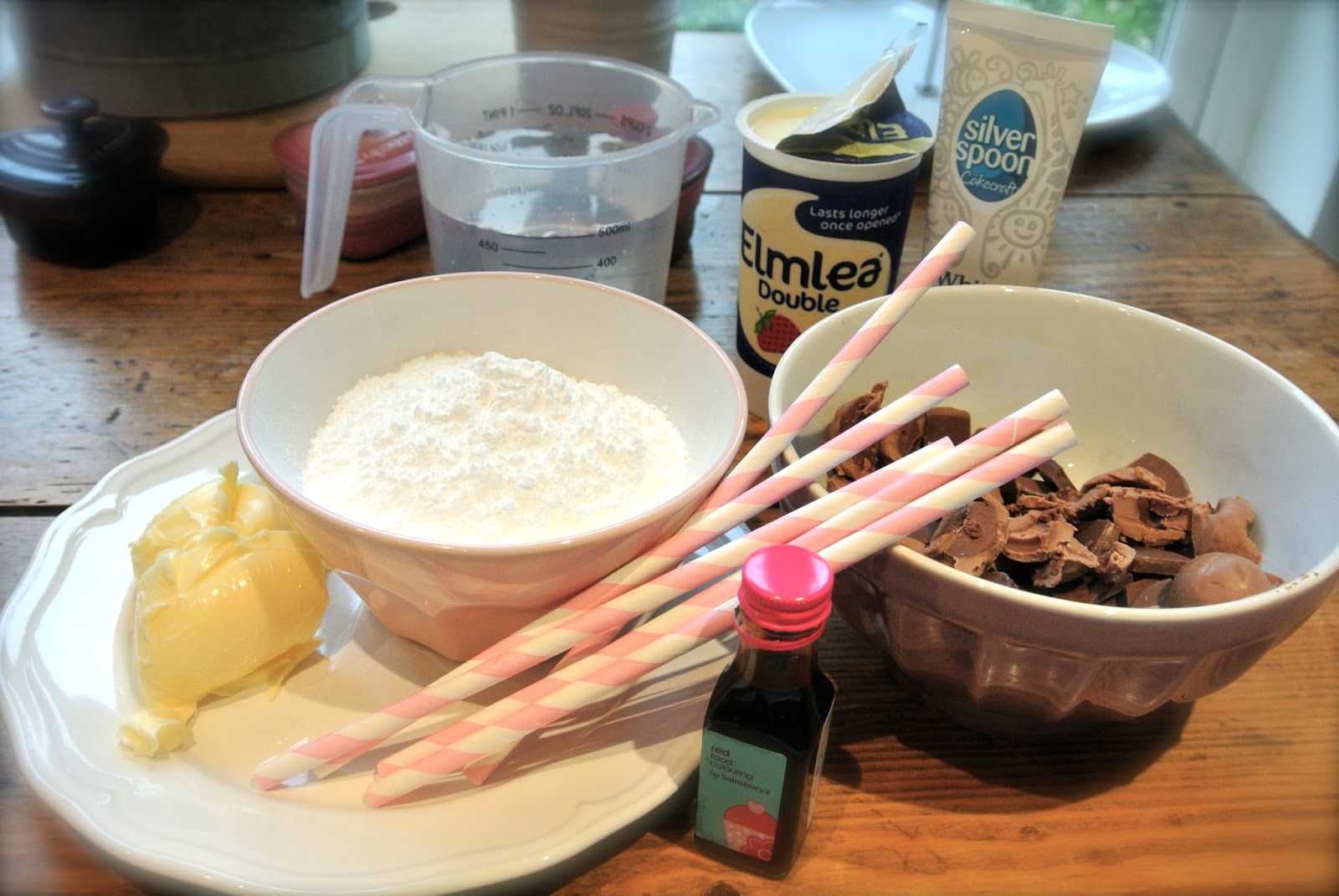 take-away theme. You will need some chocolate for melting, as well as some butter and cream to mix it with. Also, some red food colouring, icing sugar and I cheated and bought some ready made squeezy icing for the ‘cream’.