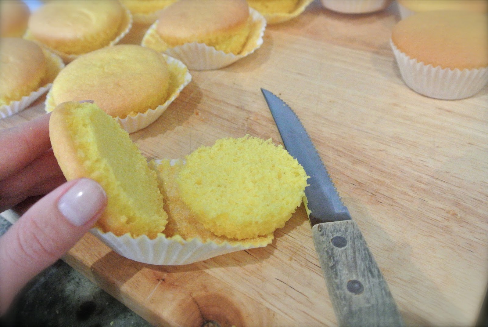 Carefully peel open the cases and then cut the cupcakes in half, just under the