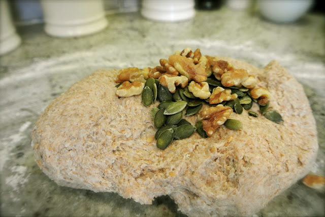 Place the dough onto a surface sprinkled with flour, and fold in the walnuts and pumpkin seeds.