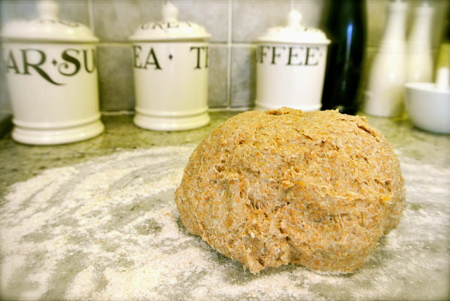 Make a well in the flour/seed mixture and pour the milk mixture in. Mix it well with your hands (it is really sticks so prepare for doughy fingers!!). Add the water slowly, you many not need it all, until you can form a ball out of the dough.