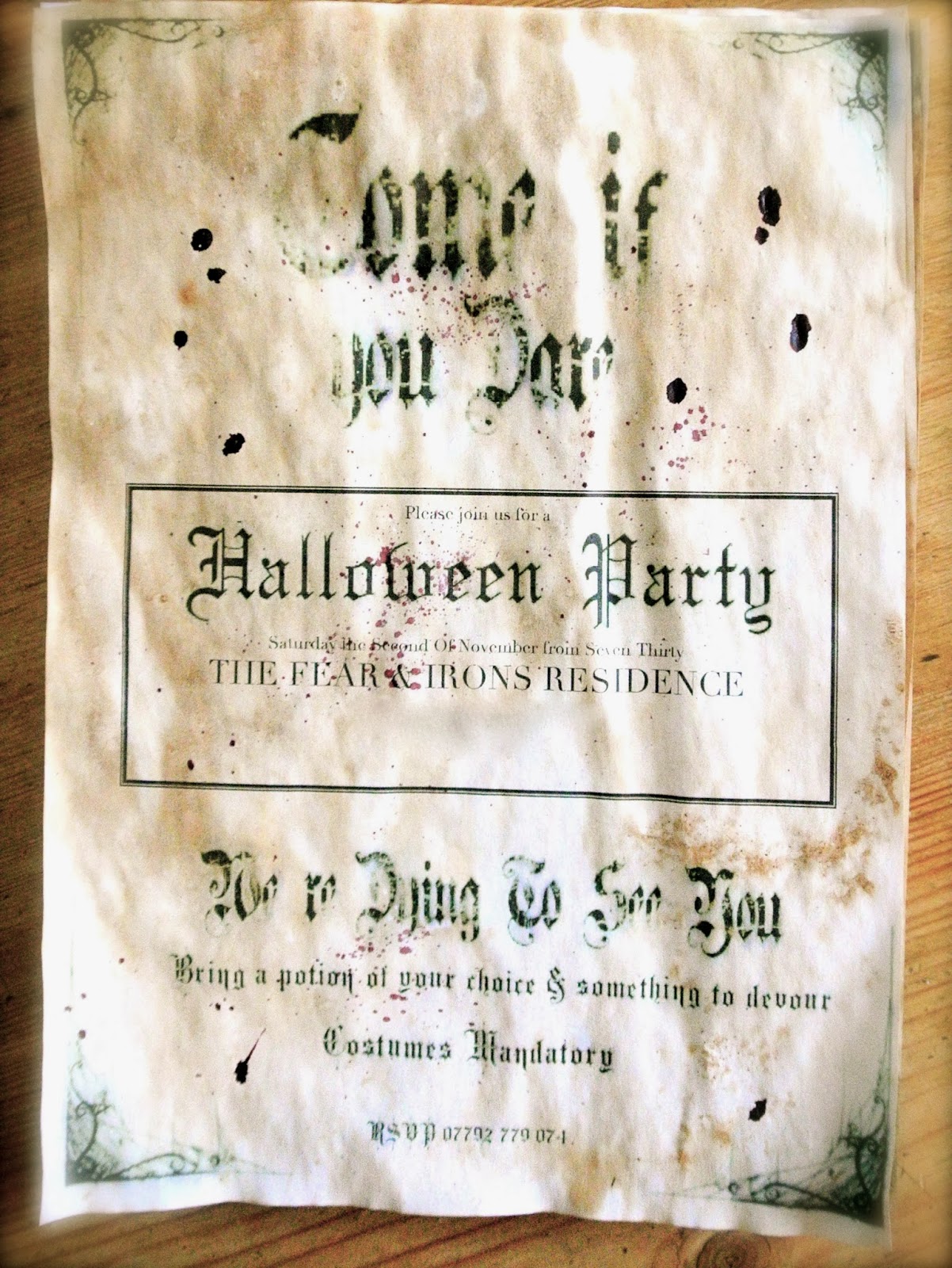 These are the invites I made this year. I didn’t use photoshop or anything fancy, just a word document with the help of some page borders from google images, and font from an online font generator.