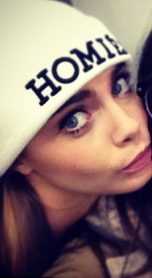 {Cara Delevinge wears a Brian Lichtenberg hat in her Selfie}
