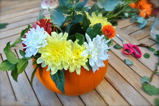 { Don’t forget to add some water into the pumpkin to keep the flowers alive! Most bouquets will come with a packet of flower food, it is a good idea to add this to the water along with a drop of bleach to deter any harmful microorganisms. }