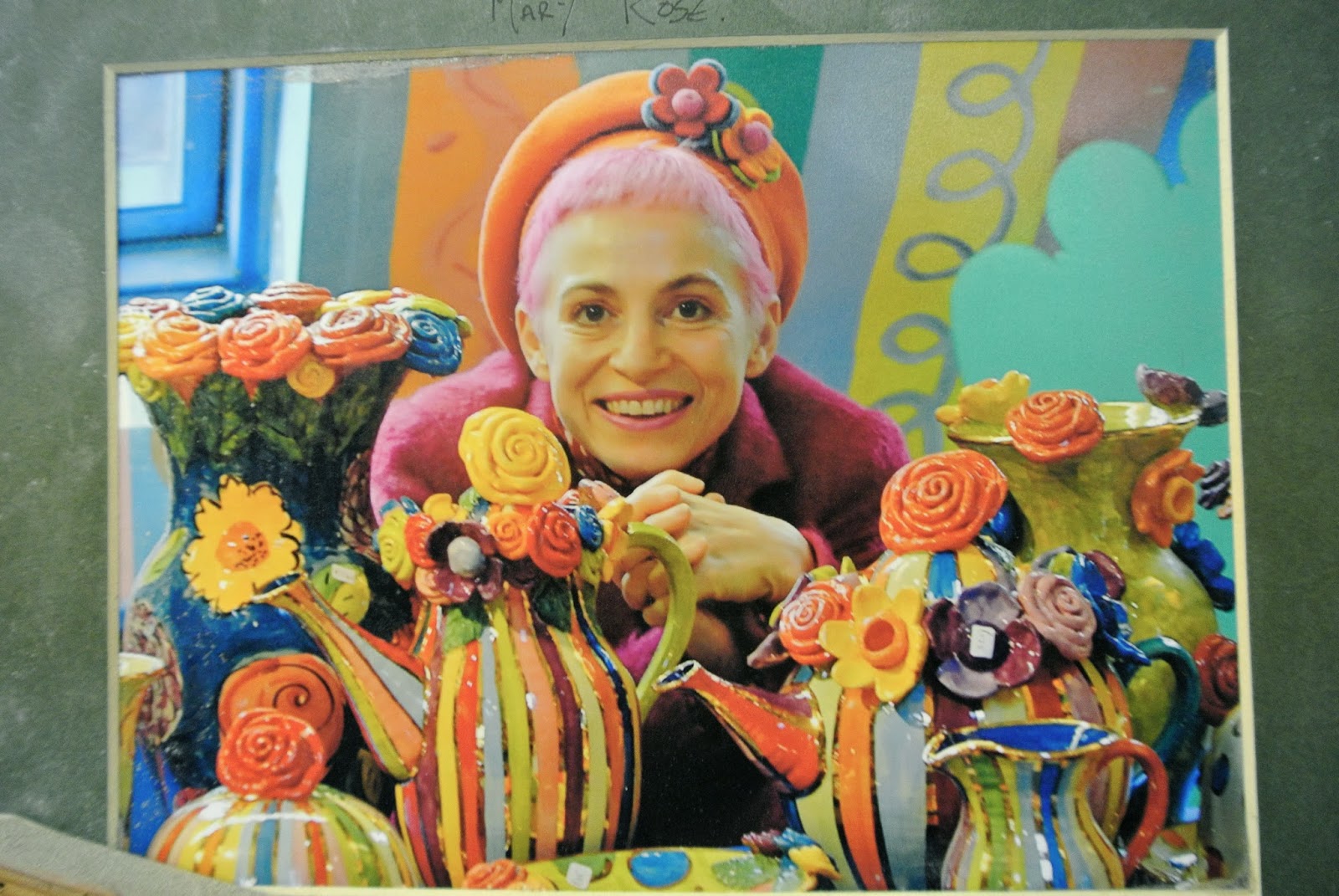 her bright pink hair, the lovely Mary Rose creates and throws all of the designs