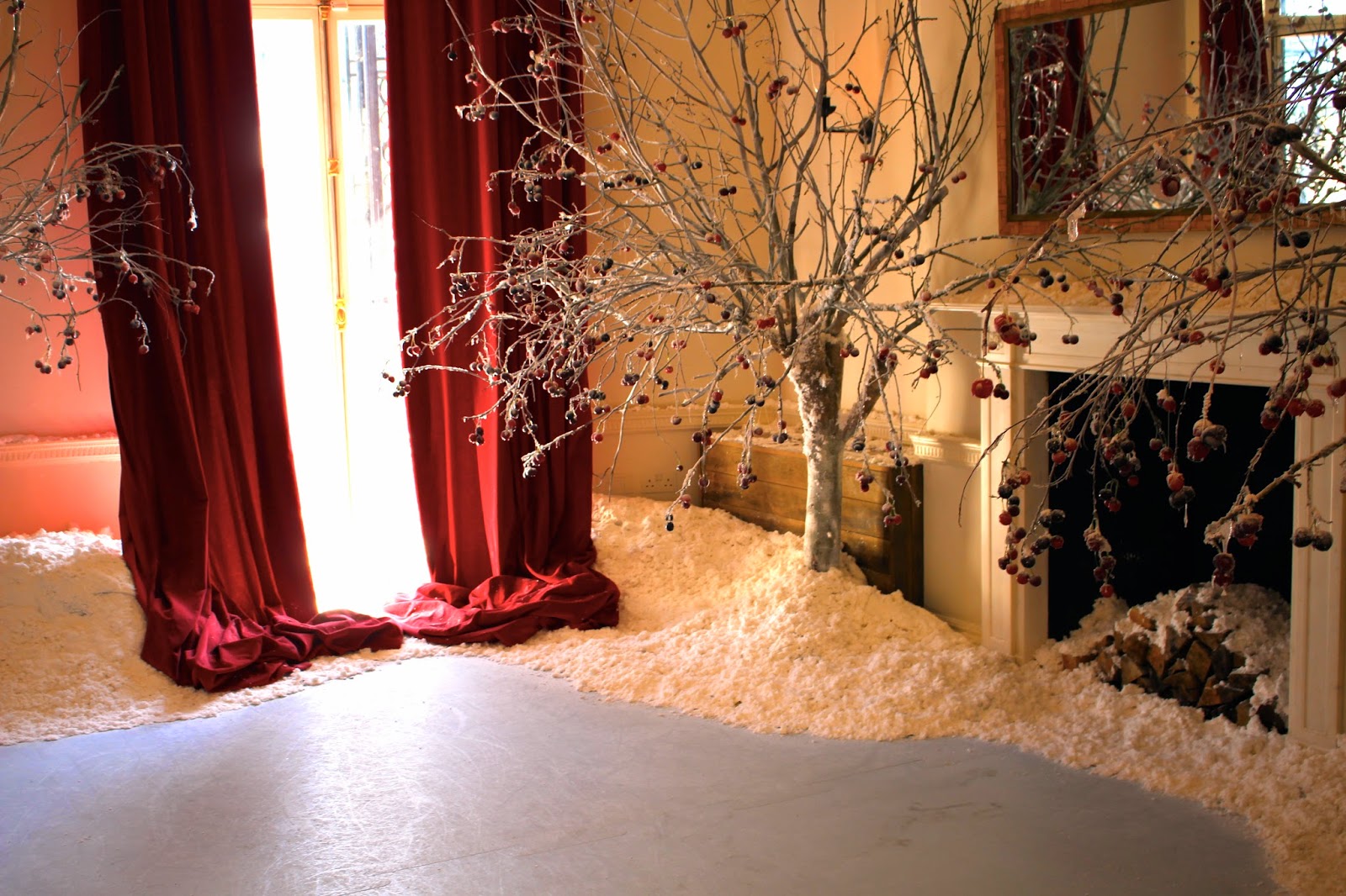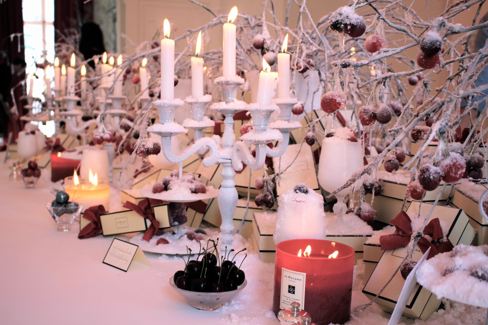 Within the next room was the most opulent, lavish Christmas table you could imagine, adorned with white and crimson livery and accessorised with a sprinkling of snow, frosted cherries and of course an array of candles, crackers and gift boxes.