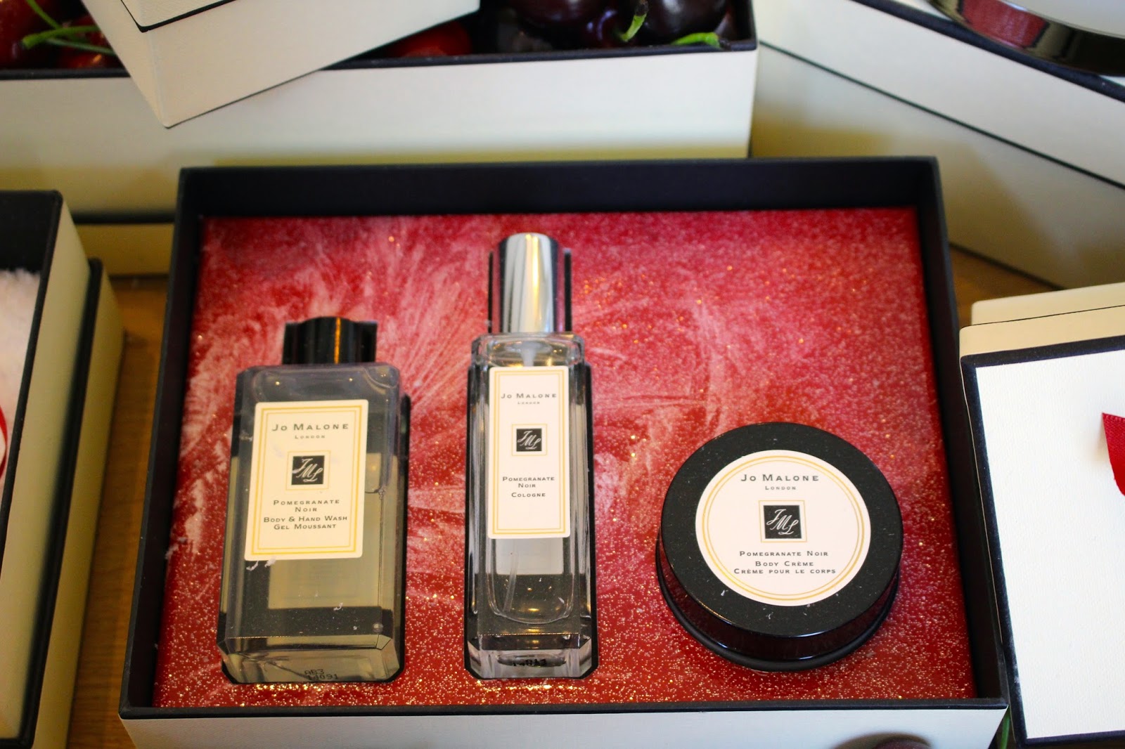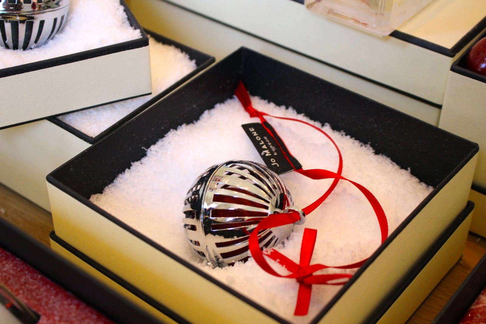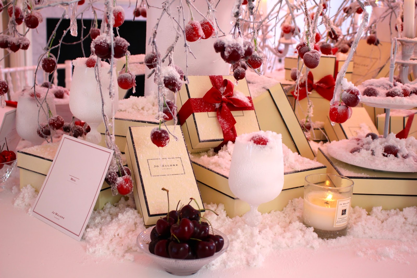 Beautifully laid out on a long table was the full festive offer – a sumptuous array of fragrances, luxurious candles and bathing products, which were complemented by stunning ribboned boxes trimmed with frosted berries. One of my favourite stocking fillers was the Cherry and Clove scented bauble in the top image above.