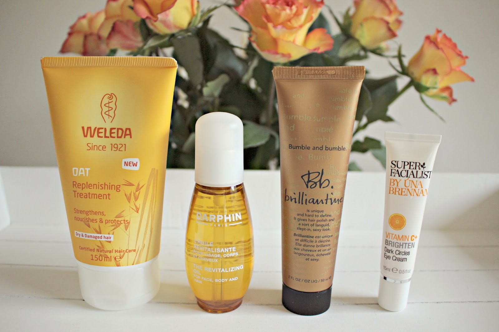 I’ve been discovering some fantastic new products over the past couple of weeks, ones which are now firmly positioned into my daily routine! With the heating being switched on at work, my hair and skin have needed some extra attention to keep them looking healthy and the products I’ve been reaching for include a Replenishing Oat conditioning Treatment from Weleda, and Brilliantine from Bumble and Bumble for my hair, while my face has been treated to the Darphin Revitalizing oil and also Dark Circles eye cream from the Super Facialist range By Una Brennan.