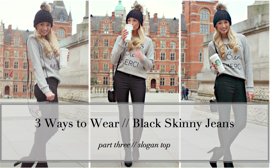 It’s the final part of my mini series where I show you three ways that I wear my black skinny jeans from New Look! The first look was a dressed down, knitted layers look wearing Warehouse and Whistles. Next, in my second look I wore an all black look but showed how skinnies can be glamorous too with some carefully chosen accessories from Dune, Whistles and Topshop. My third and final look is a mix between the two. A slogan top can be work as an everyday piece, but team it with the right accessories and it can be a chic work or play outfit too.