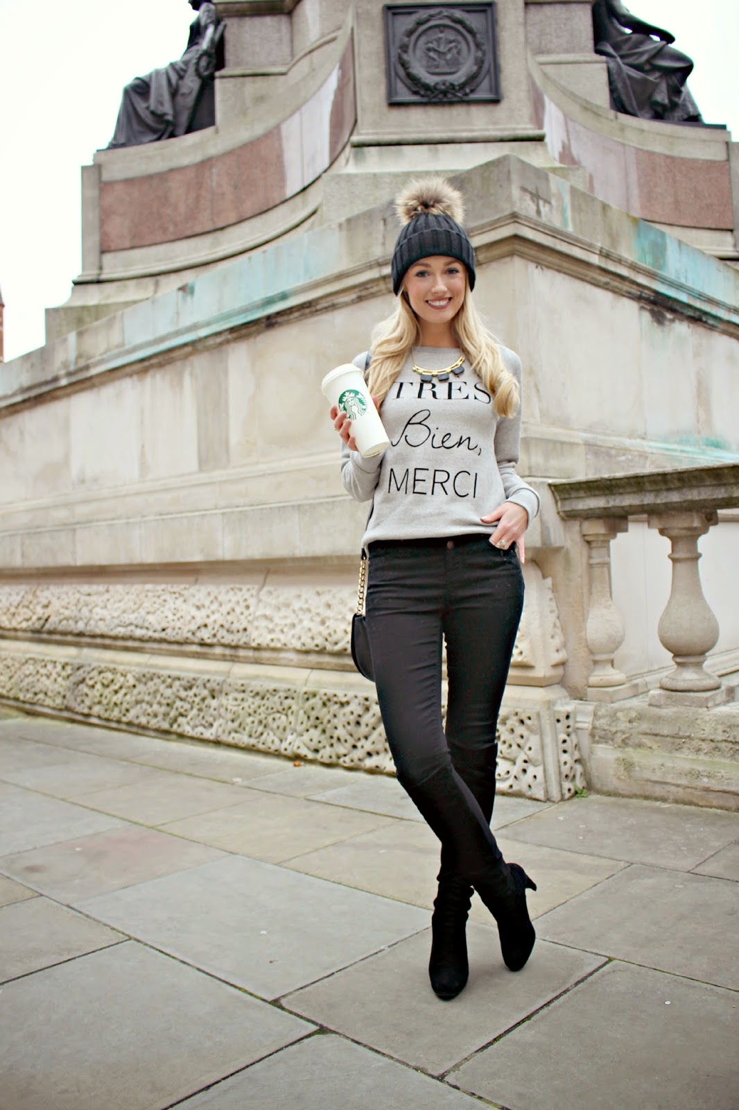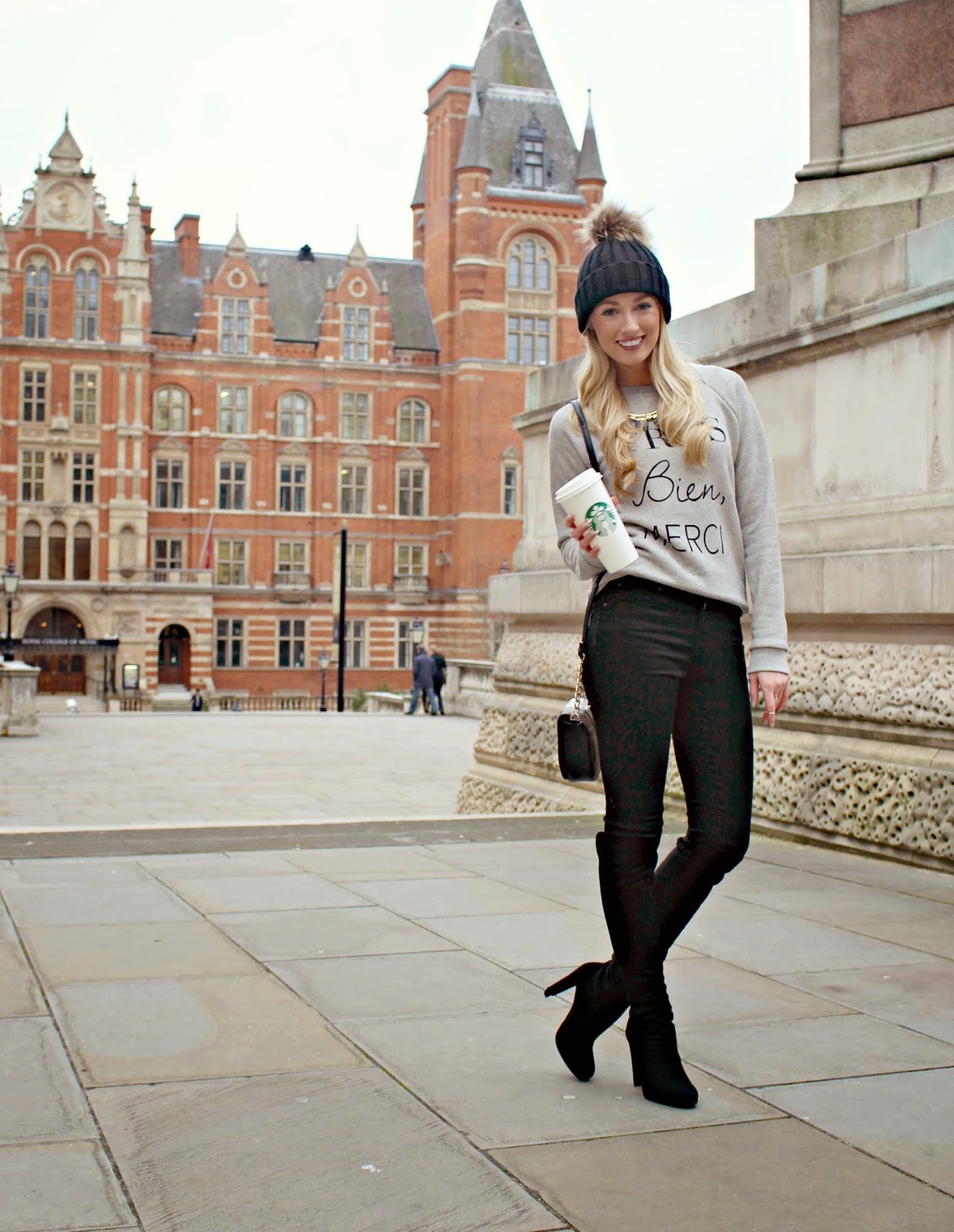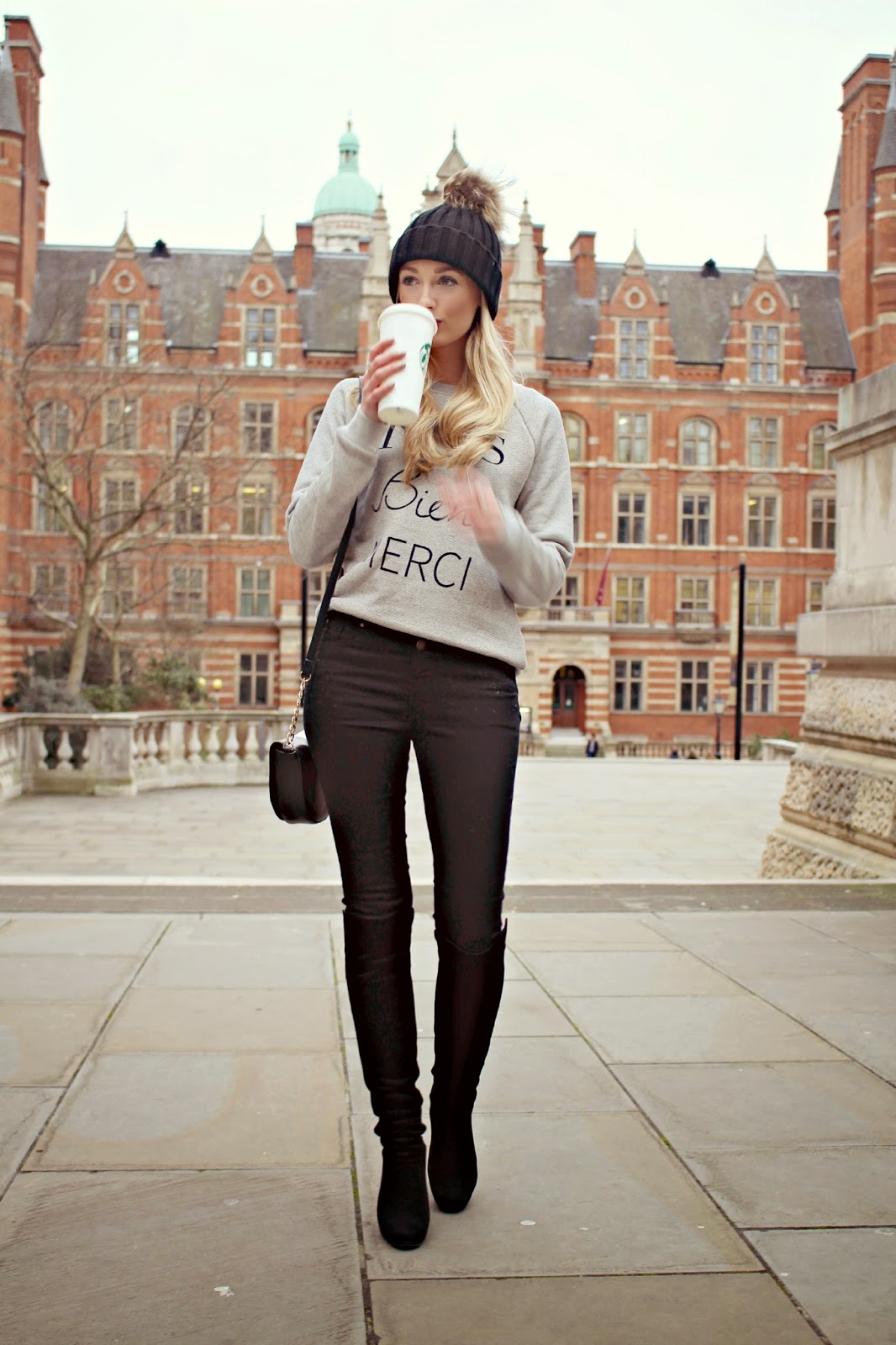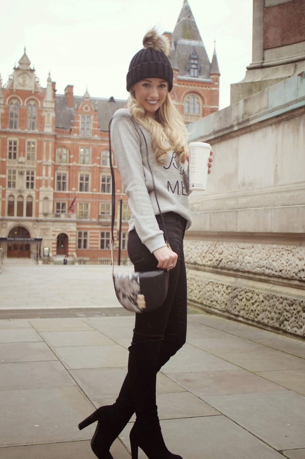 For this look I’ve styled my New Look jeans with a slogan top from Whistles, reading Tres Bien Merci. Whistles are known for their statement Grey Marl sweatshirts, and I snapped this one up as soon as I saw it! It’s the ideal piece for throwing on and achieving an easy chic look, especially with a flattering pair of skinnies. To keep the attention on the slogan top, I also wore my Russell & Bromley boots to add a bit of height but still being easy to walk in, and also a black hat from Amelia Jane London. I’ll be wearing this look to travel to New York on Saturday as its so easy to whip off the layers when you’re on the plane, then bundle them all back on again when you land!