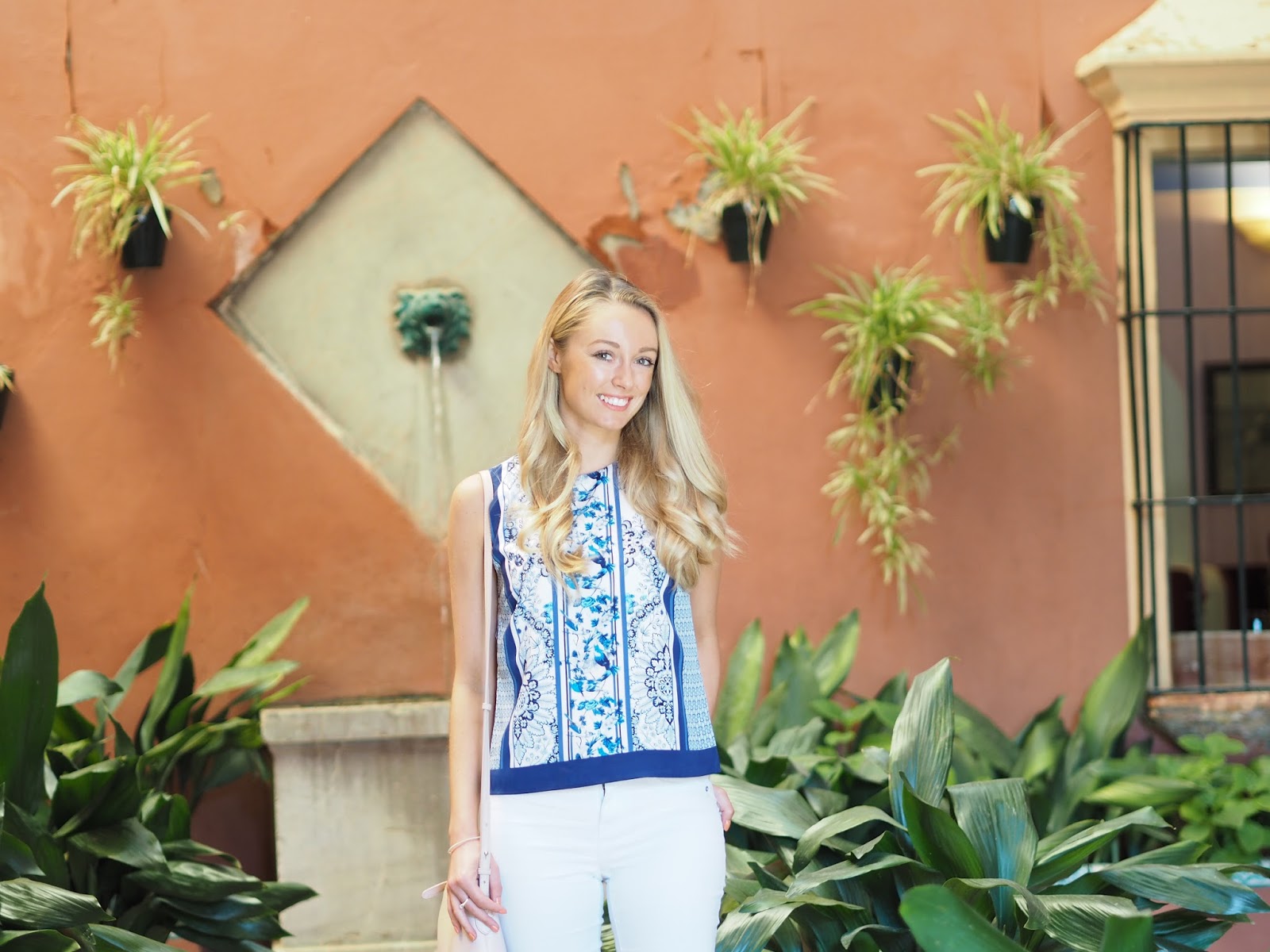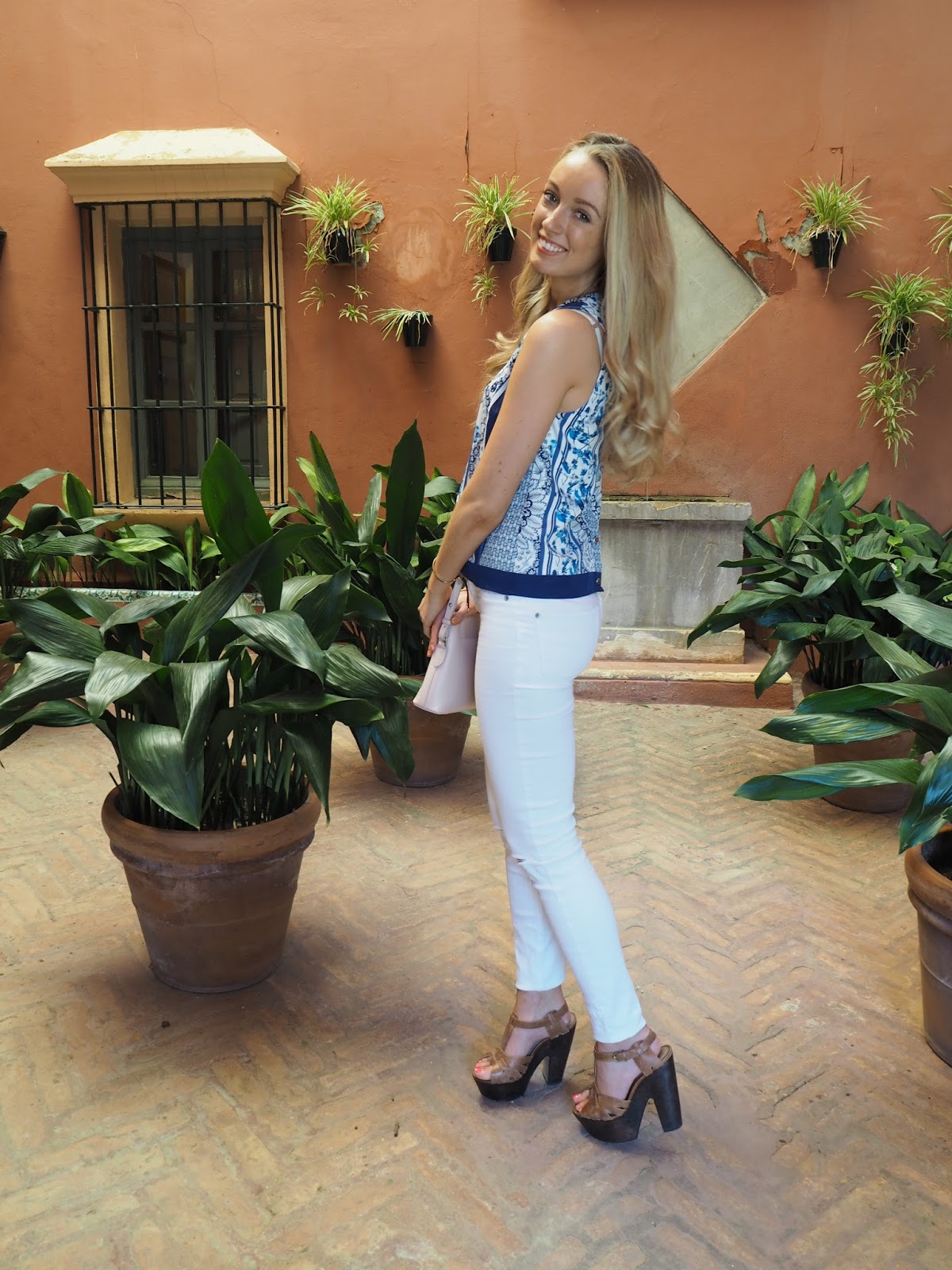 I chose this beautiful blue print blouse from to wear on our first afternoon. The gorgeous birds and blooms print works 18th century prints into a beautiful timeless top, and is part of their V&A collection. I kept the trousers plain and simple, wearing my white jeans, and I chose my wooden block heels to complete the look.