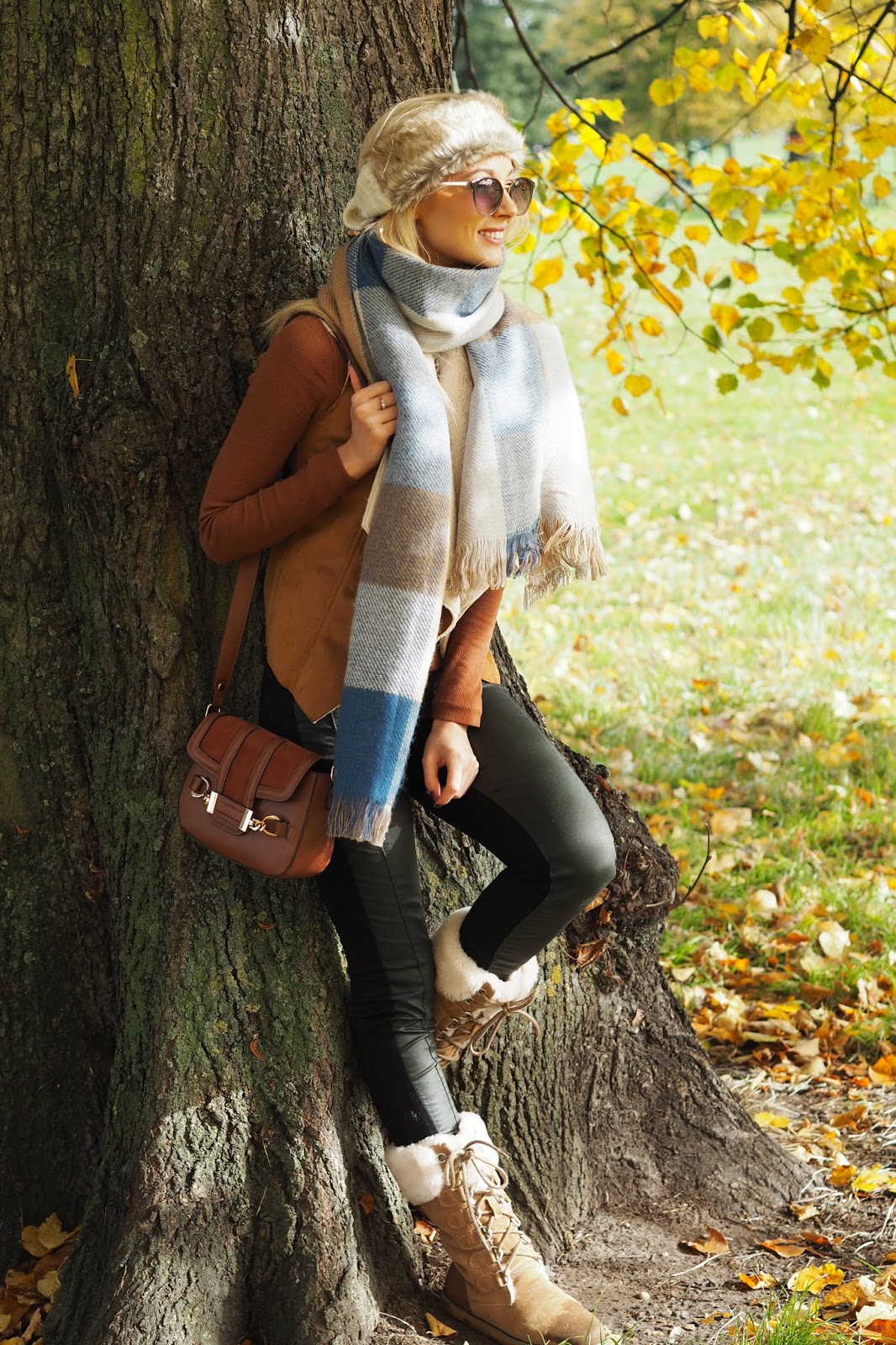 One of my favourite parts of Autumnal dressing is layering up. I’ve mentioned several times before but my favourite item of clothing for layering this season is this waterfall faux suede/sheepskin gilet from Dorothy Perkins. It’s gorgeously soft to touch, as a beautifully elegant way of hanging, and best of all, is only £29. Here I’ve layered it under a patchwork scarf in my favourite autumnal colours, and my most-worn rust coloured high neck top. A pair of dark, well fitting trousers is another Autumnal essential, and my favourite pair is this Olive green wax effect pair from Oasis. Sticking to a neutral colour palette, my Emu boots and Superdry fur headband ensure that I look on trend while being snug and cosy too!