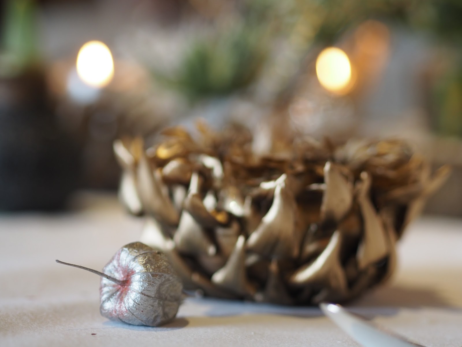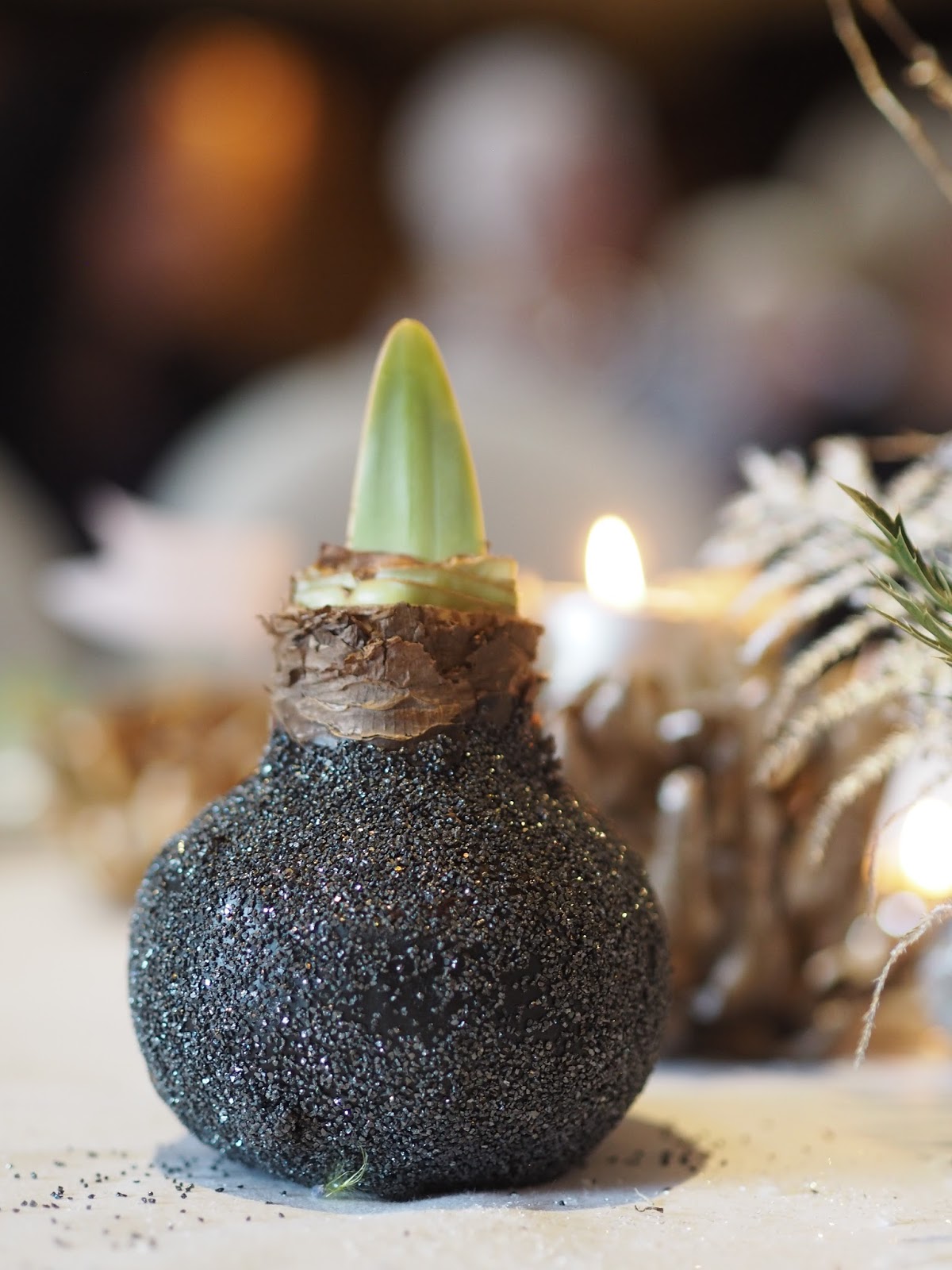 The florists encouraged us to use flora and fauna that we have at home, whether it’s dried chinese lanterns spray painted in silver or copper, or an amaryllis bulb which you can cover in glitter. Fruit and flowers can be sprayed with metallic spray paint, or coated in thin sheets of gold or silver foil.