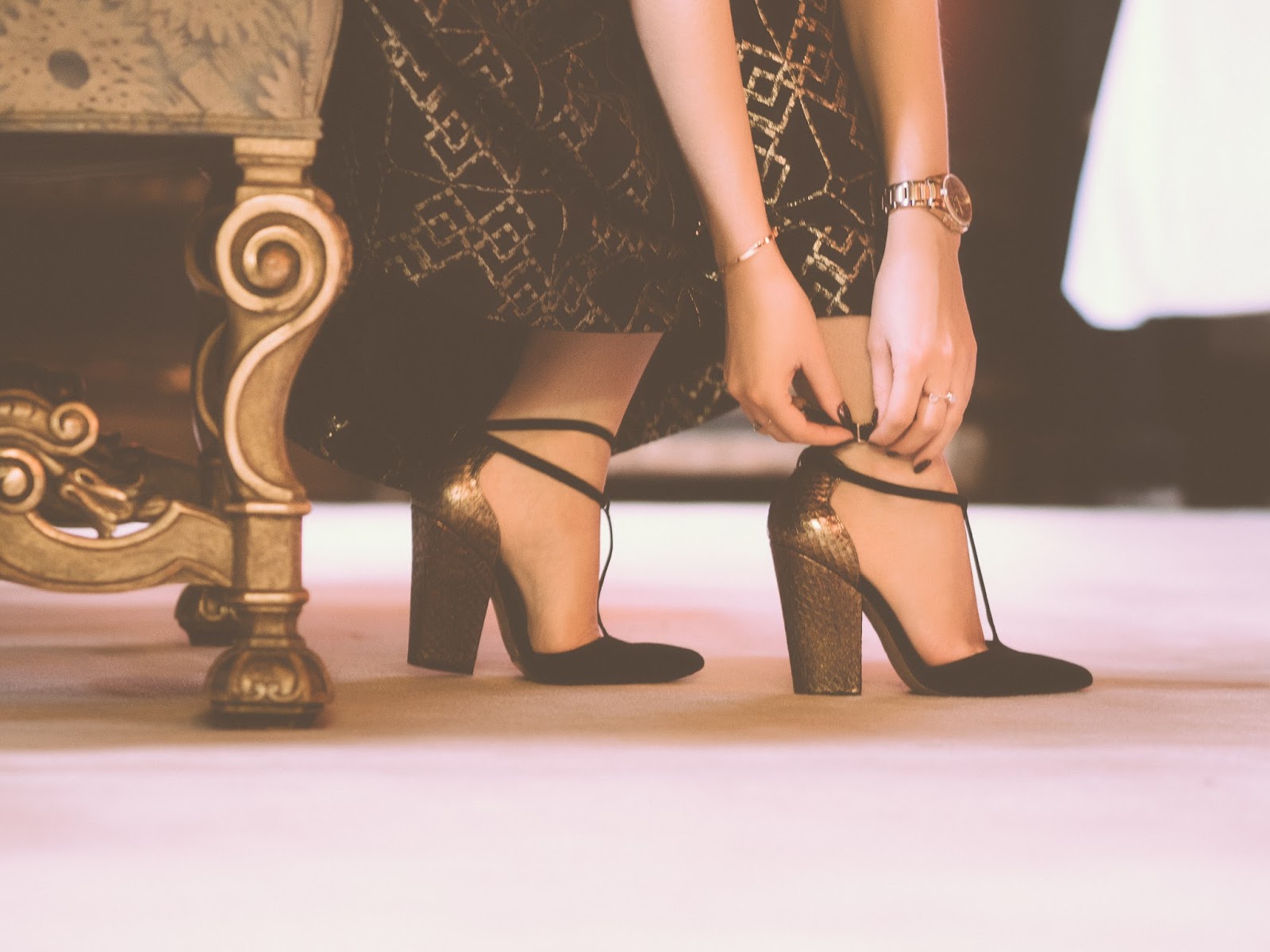 To capture the magic of the look, Jay and I headed to the beautiful Great Fosters hotel in Virginia Water, where the luxurious tudor rooms provided the perfect setting. Starting with my favourite lipstick, of course, the makeup look was a glowing yet classic look, completed with my . My essentials were enclosed within this fabulous suede sphere bag by (currently in the sale, might I add!) which perfectly matches my black and gold sandals – a wardrobe staple which I purchased from Reiss two Winters ago.