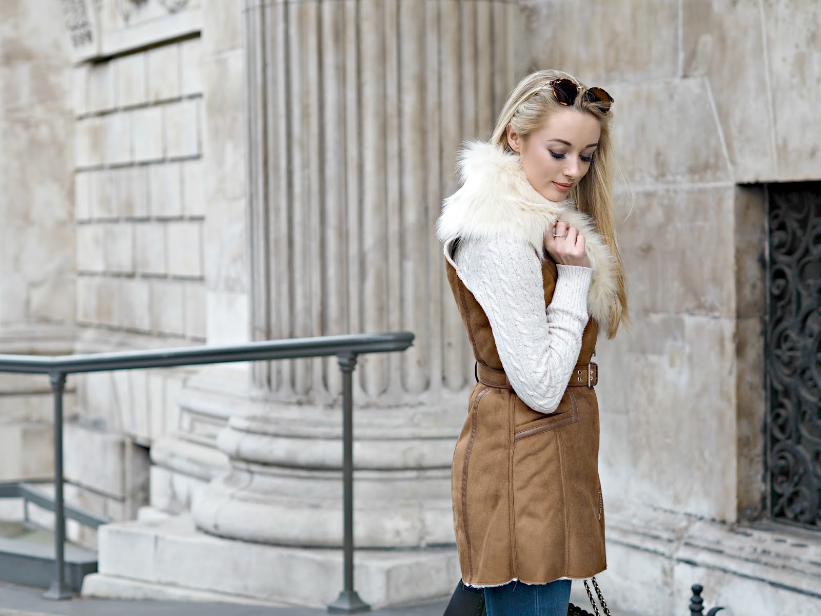 Faux Fur Gilet by | Jumper by | Sunglasses by | Jeans by | Boots by Ted & Muffy | Bag by | Watch by